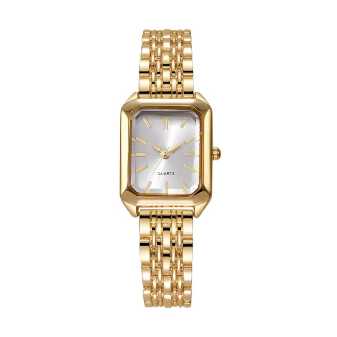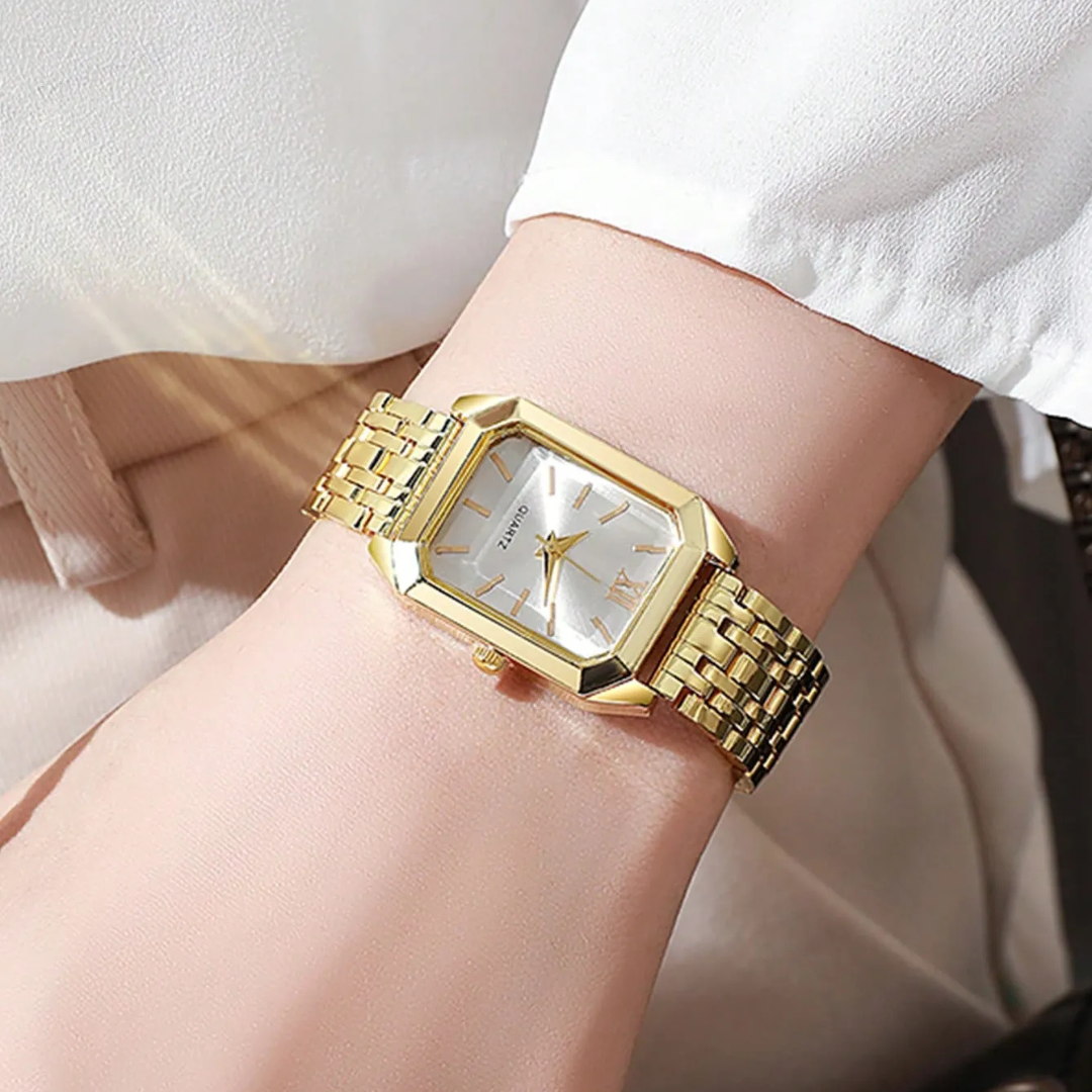 Acest ceas cu cadran pătrat aduce un design modern și sofisticat care scoate în evidență orice ținută. Realizat din oțel inoxidabil, oferă o strălucire de durată și rezistență la utilizarea zilnică. Forma neobișnuită atrage privirile și subliniază personalitatea ta unică. Ideal pentru femeile care iubesc stilul cu atitudine. O bijuterie funcțională și atemporală.