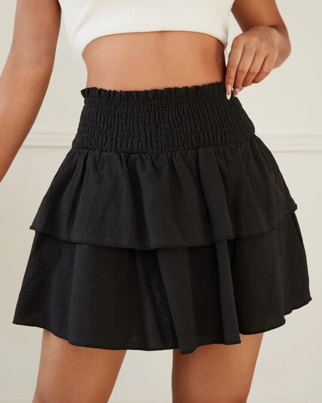 Această fustă scurtă are un farmec aparte datorită taliei sale împodobite cu volane duble, care creează un aspect ușor și delicat. Perfectă pentru ținute proaspete și elegante.